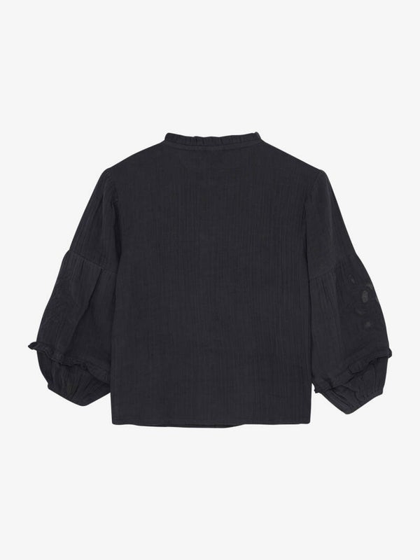 Prachtige blouse van 100% katoen van Daily7Kids. De blouse heeft een mooi ruchedetail bij de kraag, schattige ballonmouwen met ruchedetail en elastiek aan het uiteinde, en een mooi borduursel op de mouw. De blouse sluit met knoopjes aan de voorkant.
