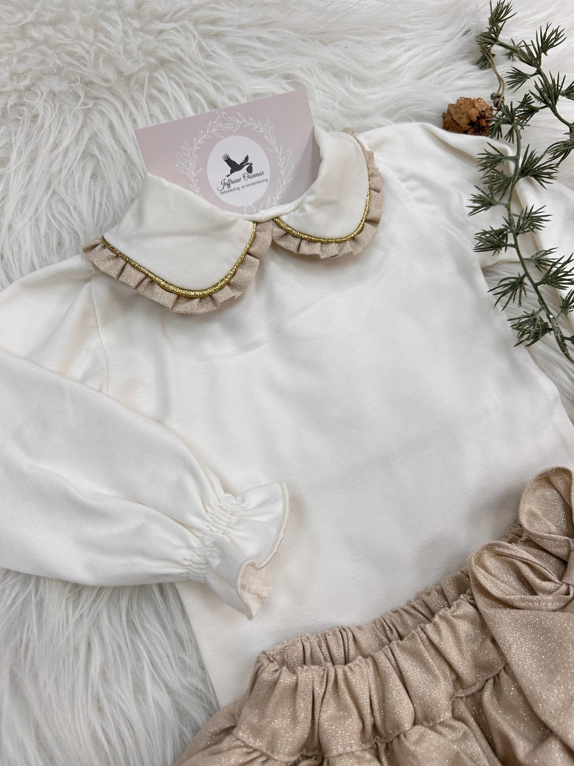 Custom made bij Juffrouw Ooievaar. Een prachtige body met kraagje en gouden bies. Ook langs de mouwtjes.