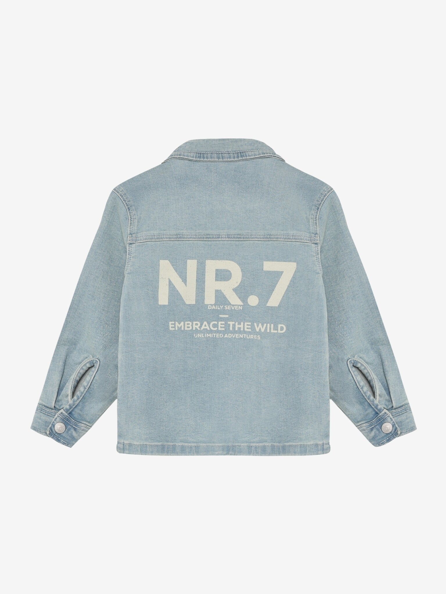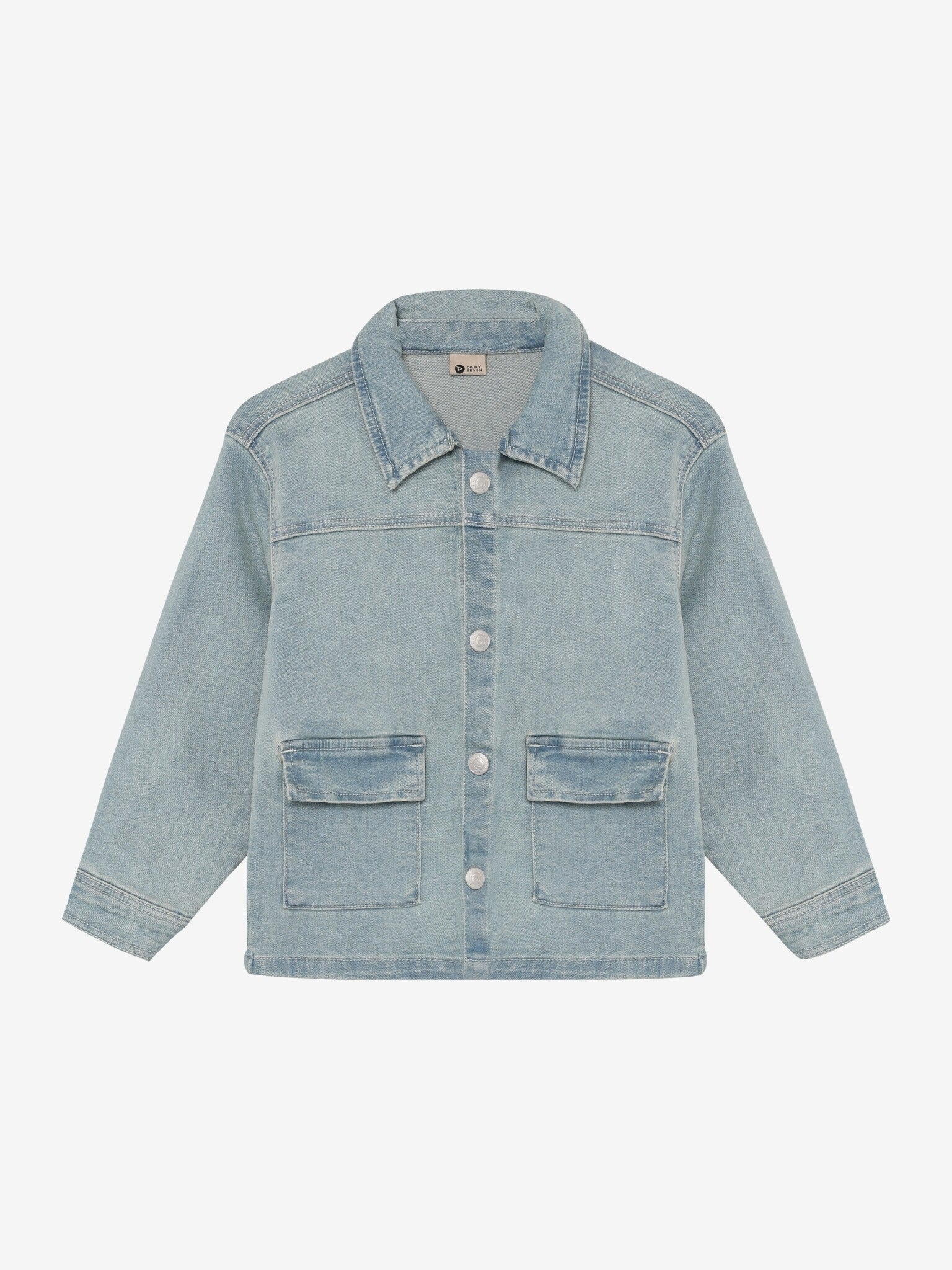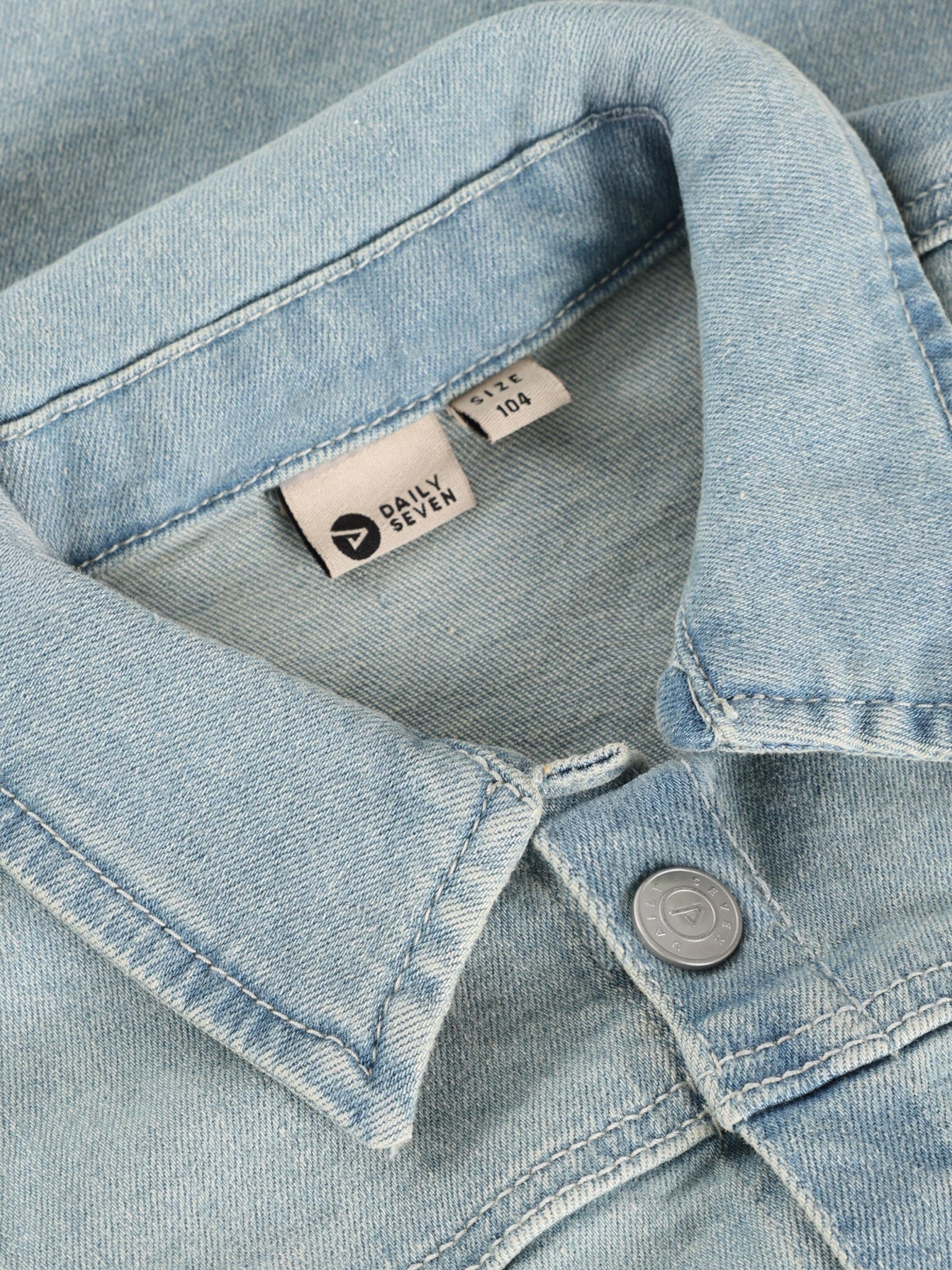 Spijkerjas van Daily7Kids. De jas heeft een opstaande kraag en sluit met knopen. Daarnaast heeft hij voorzakken en een print op de achterkant. Gecertificeerd volgens OEKO-TEX® STANDARD 100 Cert. No. 2276-364 DTI